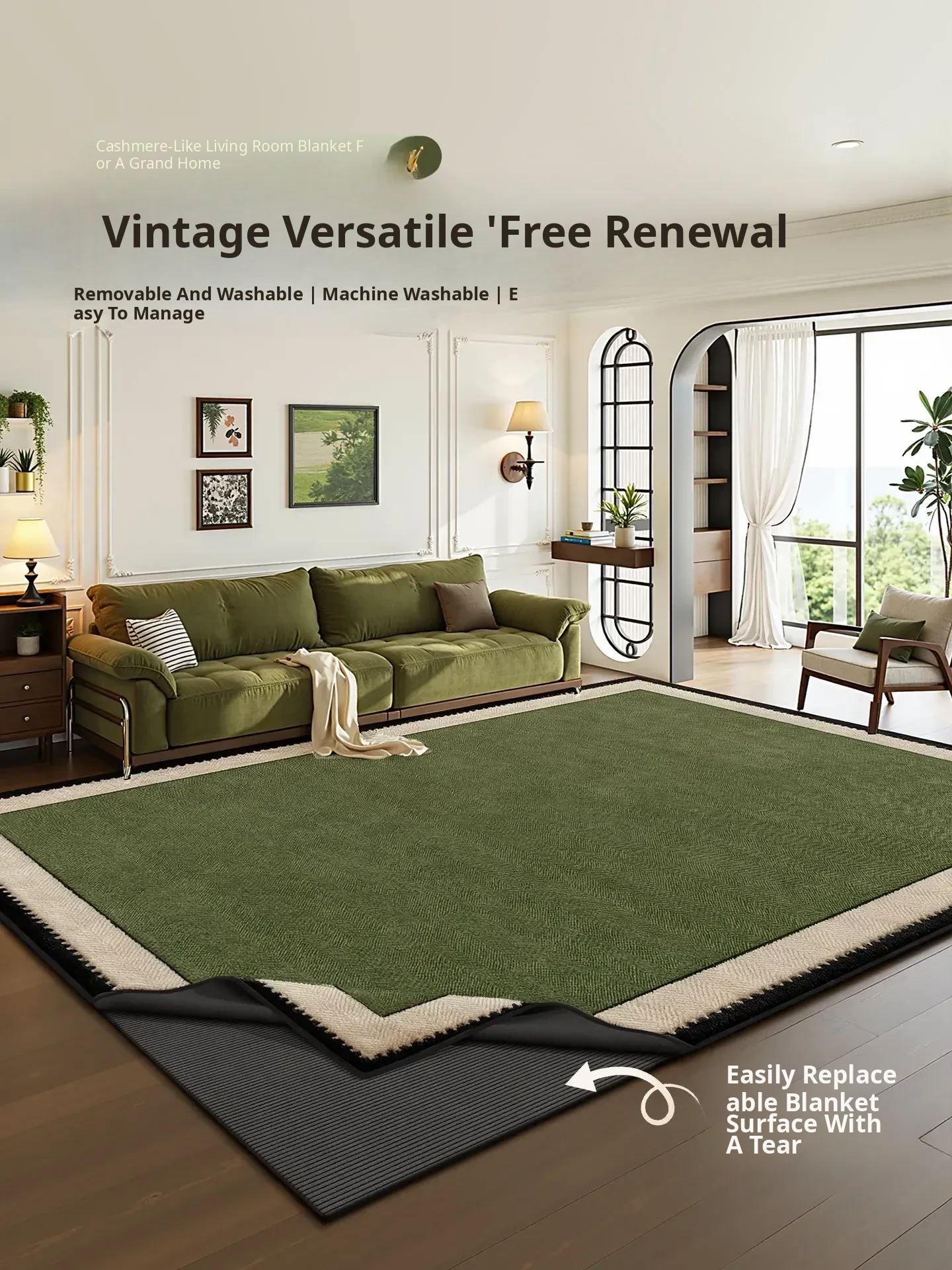French Vintage Style Washable Carpet - 2026 New Green Retro Living Room Area Rug, Double Layer Detachable Design for Bedroom Comfort