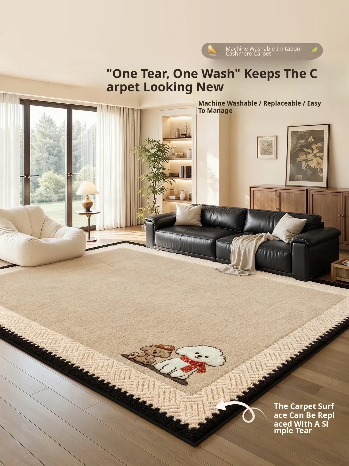 French Cartoon Removable Carpet for Living Room - High-Quality, Non-Slip, Stain-Resistant, Double-Layer Machine Washable Area Rug for Bedroom