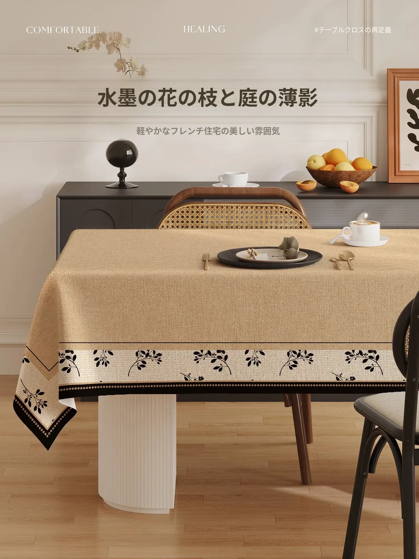 フレンチシックな高級感漂うバンブー麻テーブルクロス - お手入れ簡単!防水・防油機能付きで、どんなテーブルにもピッタリ。洗練されたデザインで、あなたのリビングを一段と引き立てます。