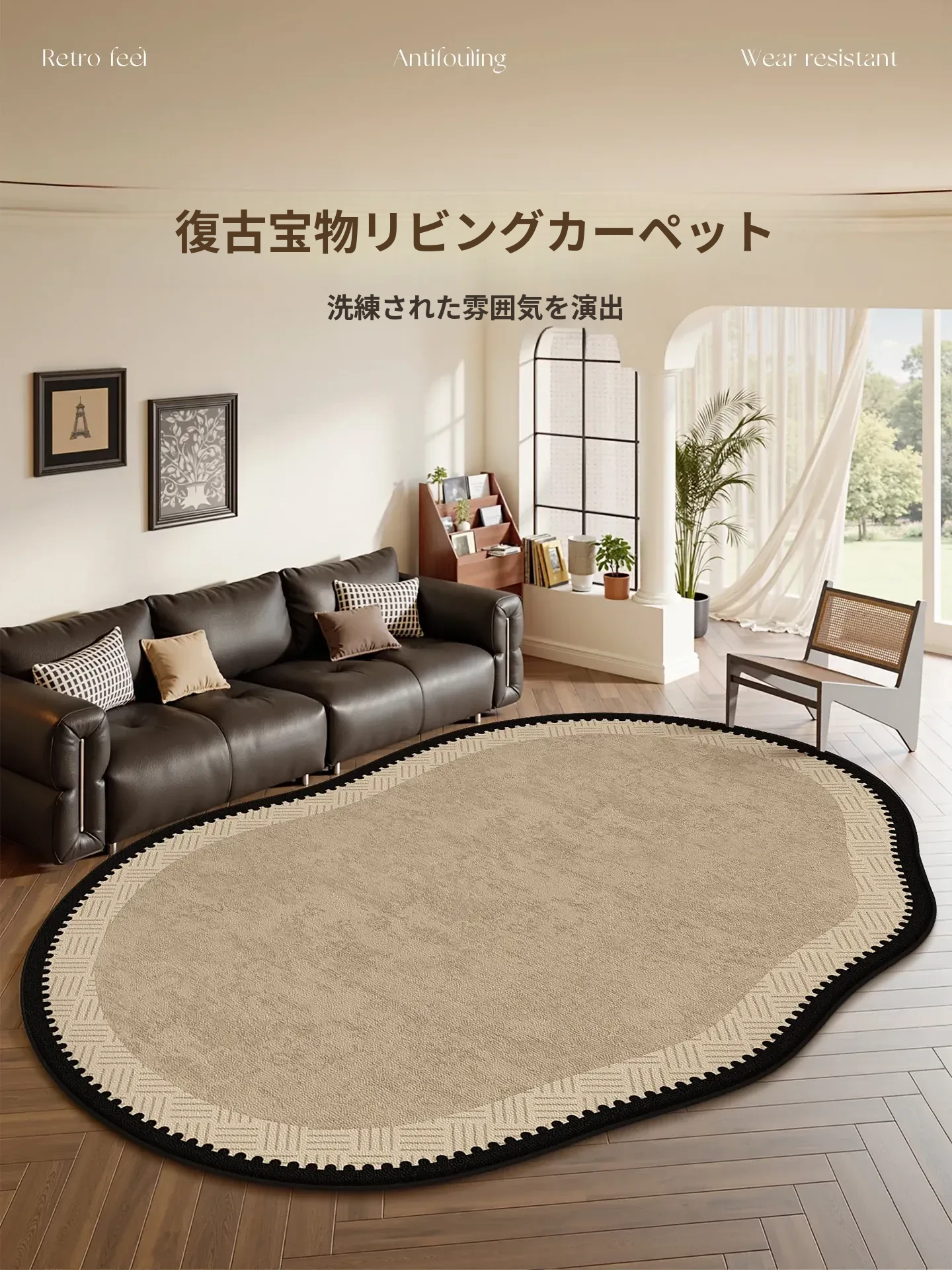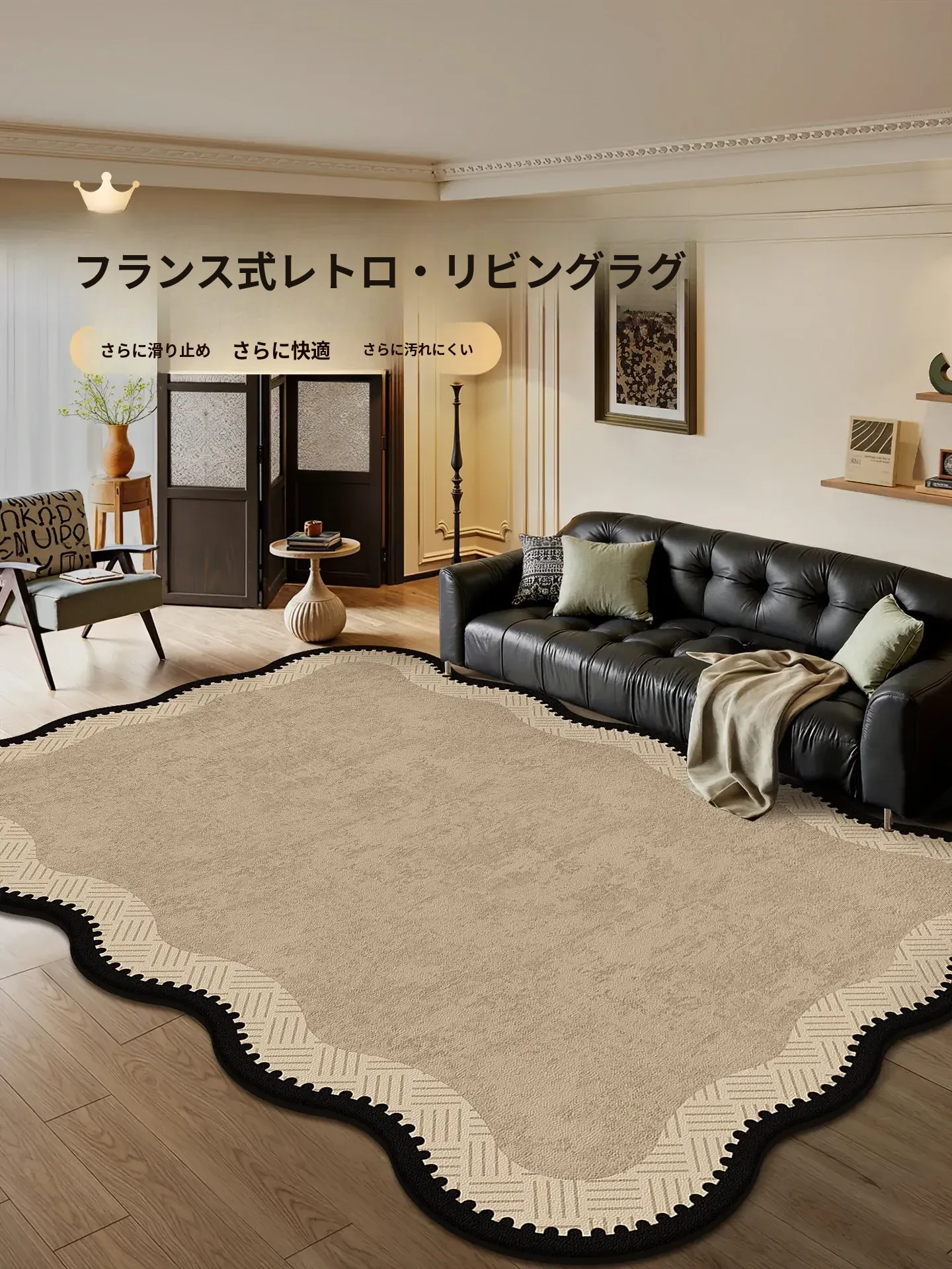 2025年新作!お手入れ不要のフレンチヴィンテージスタイル、リビング・ベッドルームにぴったりな高級感あふれる不規則形状のカーペット。ソファの下に最適なデザインで、魅力的な空間を演出します!