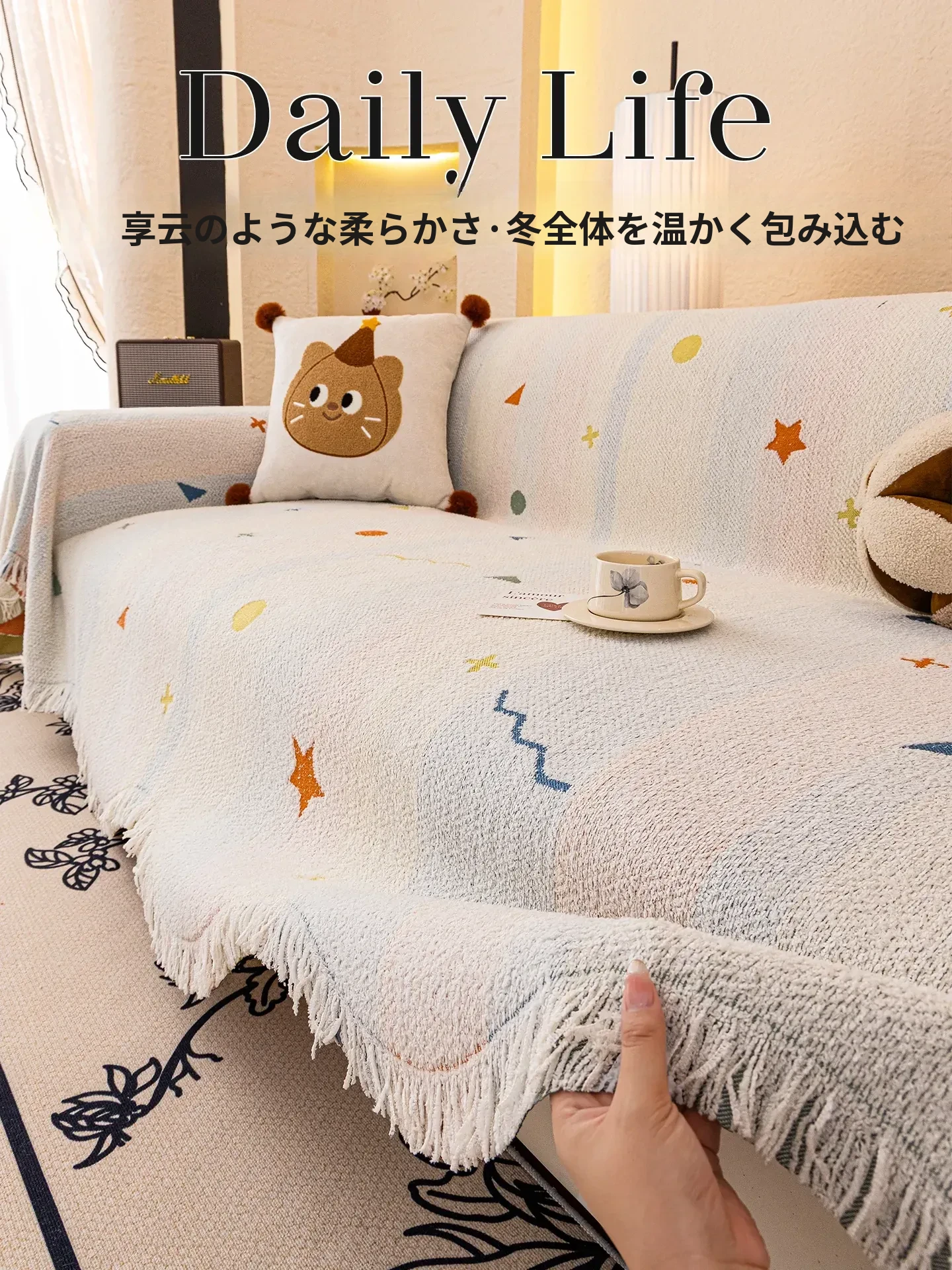 2025年冬季新作!可爱なキャラクターのぬいぐるみソファカバー - 猫の爪から守る、クリスマスにぴったりな全カバータイプ!お部屋を暖かく可愛く彩る、ふわふわのブランケットです。