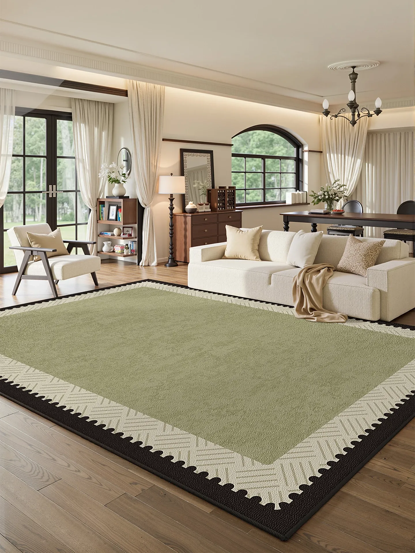 2025年新作!フランス風ヴィンテージリビングルームカーペット - おしゃれなグリーンの寝室用ラグ。洗濯不要で簡単お手入れ!高級感あふれる滑り止めデザインで、ソファにぴったりの一品です!