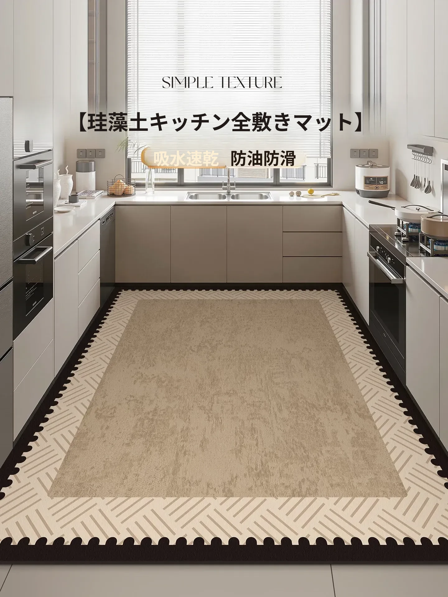高級感あふれるキッチン用防滑・防油マット!汚れに強く、お手入れ簡単なシリカゲル吸水マット。全体に敷けるので、キッチンを美しく保ちます。