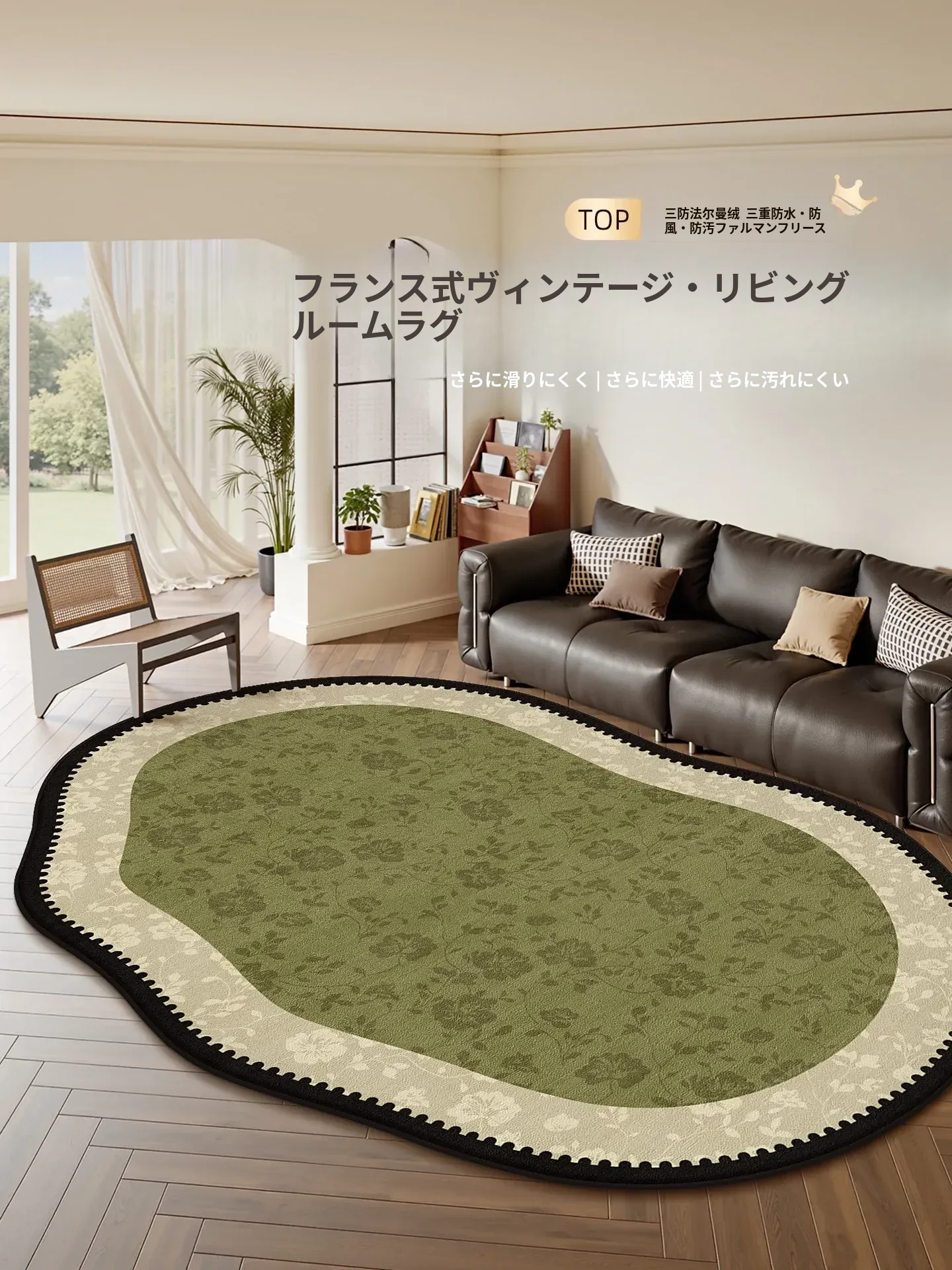 フレンチアンティークスタイルの不規則な形状のリビングカーペット2025年新作!滑り止め機能付きで、洗濯不要の便利なデザイン。寝室やソファの下にもぴったりなアイテムです!